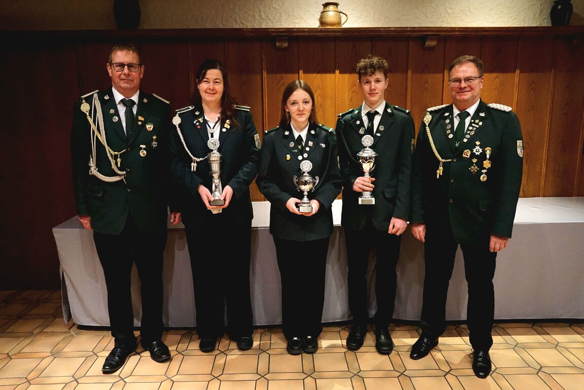 Die Wanderpokale für die besten Schützen beim Bedingungsschießen sicherten sich Malin Hillmann bei den Jungschützinnen, Lesley Griepenstroh-Whitefield bei den Schützendamen und Hennes Willmann bei den Jungschützen. Bei den Schützen und in der Gesamtwertung war Ralf Eikenhorst mit 117 Ring am zielsichersten.